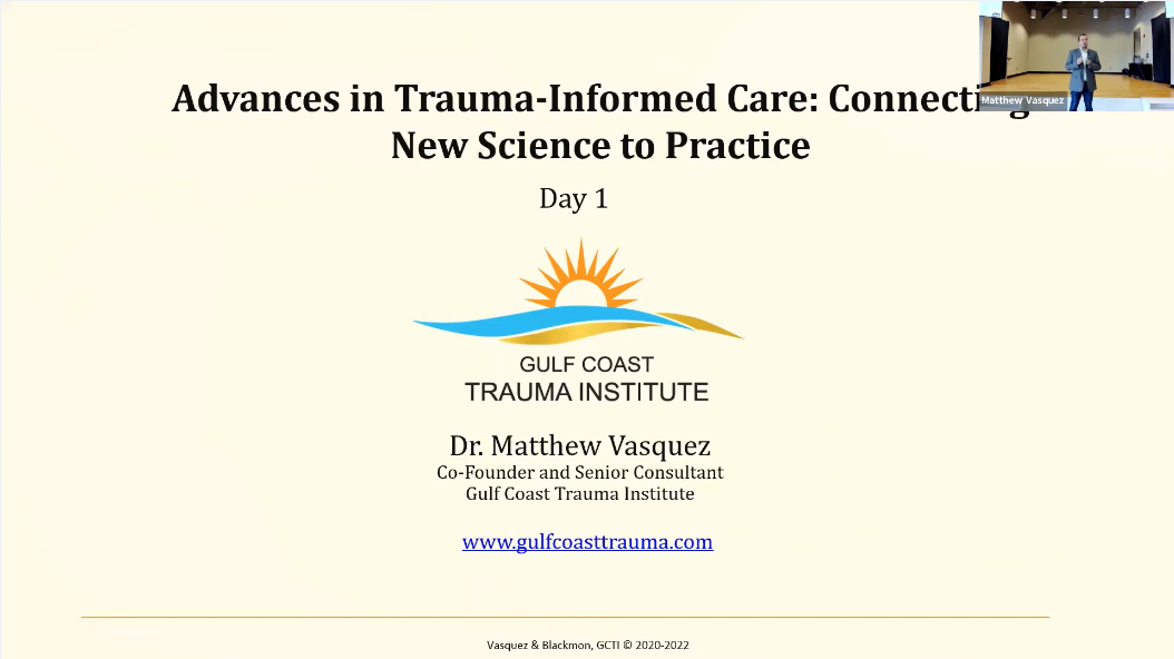 This video includes segment two (2hr, 40min) of a workshop entitled, Advances in Trauma-Informed Care: Connecting New Science to Practice. In this segment, Dr. Matthew Vasquez, Co-Founder of the Gulf Coast Trauma Institute, presents on polyvagal theory, complex trauma and the default mode network...